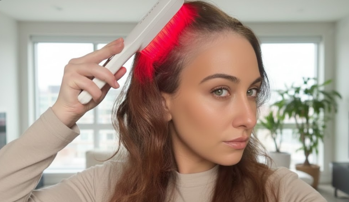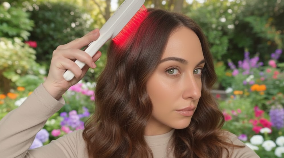 Red light therapy uses low-level wavelengths to stimulate blood flow and cellular activity in the scalp, promoting healthier follicles and hair growth.